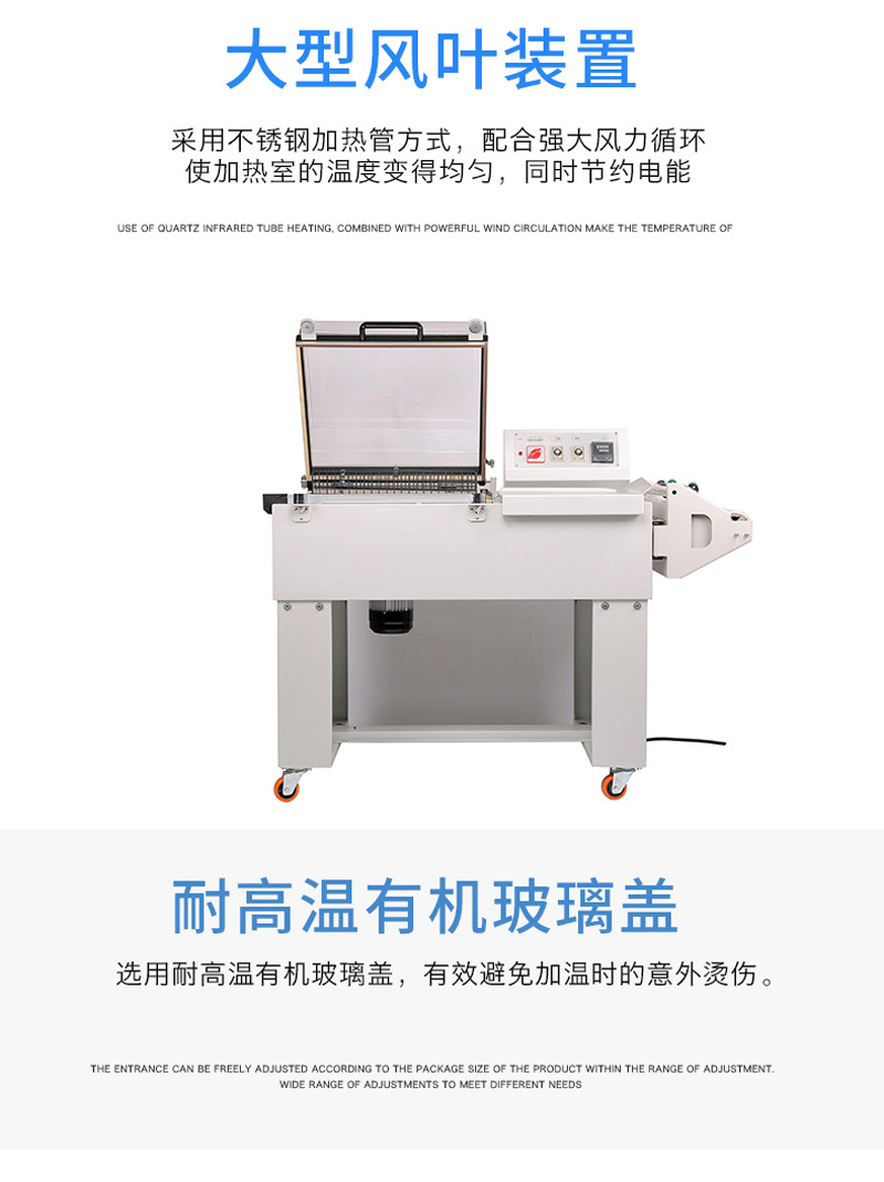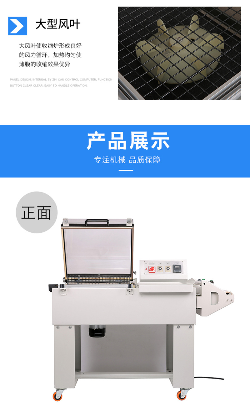 - 二合一的設計使得包裝過程更加緊湊和高效。一次操作即可完成封切和熱收縮兩個步驟,大大提高了生產效率。與傳統的分別進行封切和熱收縮的設備相比,節省了時間和人力成本。