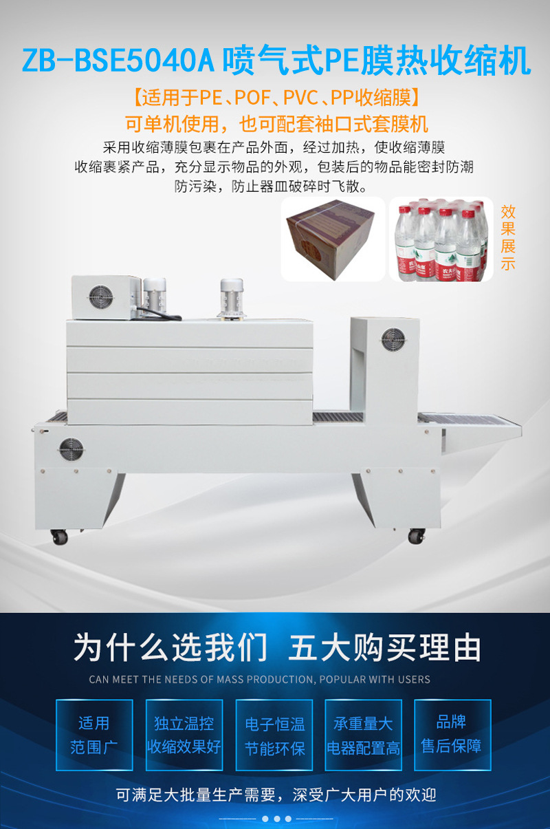 PE 膜熱收縮機具有較高的加熱效率和收縮速度,能夠在短時間內(nèi)完成產(chǎn)品的包裝,提高生產(chǎn)效