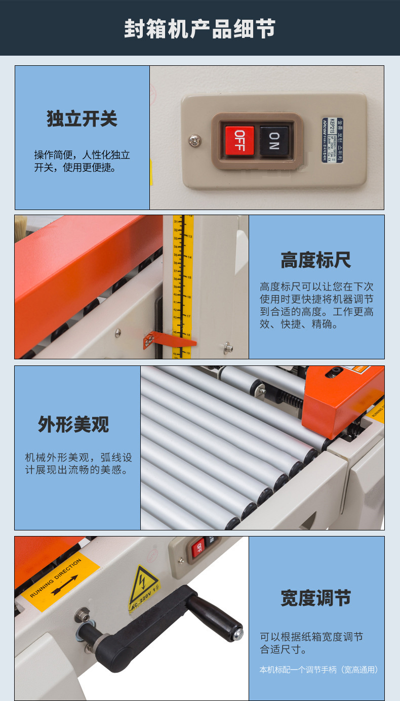 - 有膠帶支架、膠帶切割裝置和膠帶粘貼裝置等部分。膠帶支架用于放置膠帶卷,膠帶切割裝置能夠準(zhǔn)確地將膠帶切斷,避免膠帶過長或過短影響封箱效果。膠帶粘貼裝置則通過壓力滾輪等結(jié)構(gòu)將膠帶粘貼在紙箱上,并且可以調(diào)整粘貼的壓力,適應(yīng)不同厚度的紙箱。