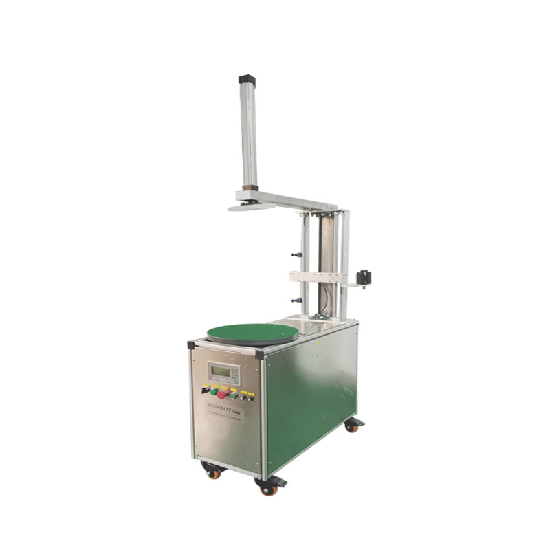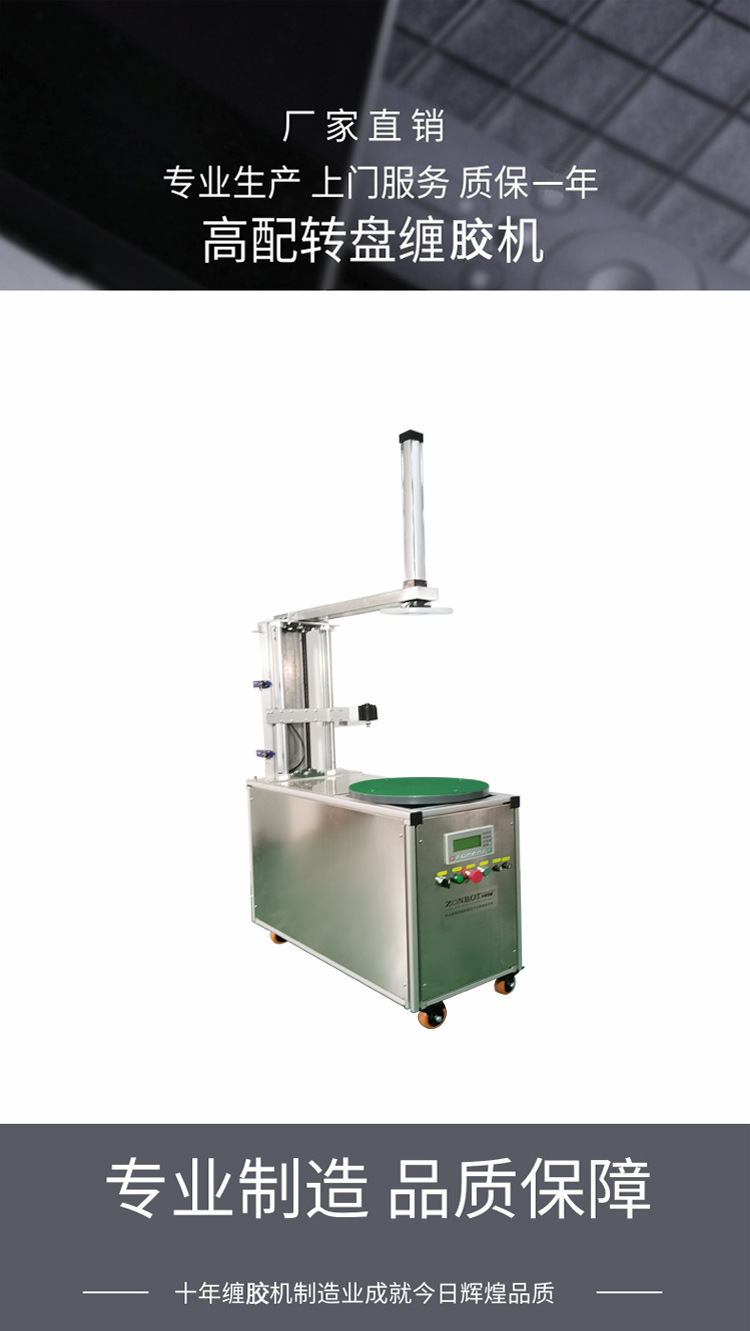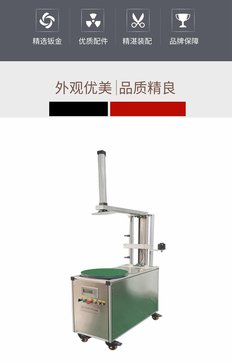 - 工作原理:通過電機驅動轉盤勻速旋轉,貨物放置在轉盤中心位置,依靠摩擦力隨轉盤一同轉動,與此同時,膠帶輸送裝置按照設定的速度、角度、圈數送出膠帶,使其一圈圈緊密纏繞在貨物表面,達到保護、固定、包裝的目的。