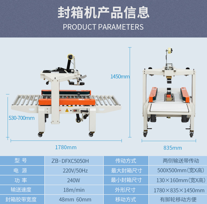 - 按封箱方式分類:有膠帶封箱機(jī)和熱熔膠封箱機(jī)。膠帶封箱機(jī)使用膠帶進(jìn)行封箱,操作簡單,成本較低,封箱效果牢固且美觀,適用于大多數(shù)紙箱包裝;熱熔膠封箱機(jī)使用熱熔膠封箱,封箱速度快,膠水粘性強(qiáng),適用于對封箱強(qiáng)度要求較高的場合,如較重物品的包裝。