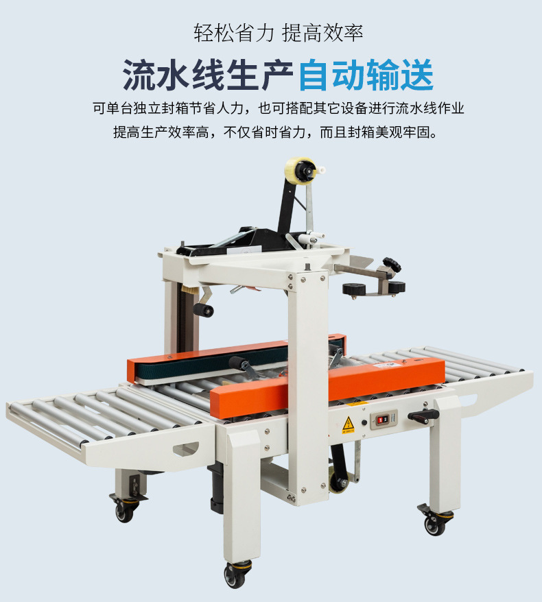 紙箱自動封箱機具有廣泛的用途,適用于家用電器、紡織、食品、日用百貨、藥品、輕工、化工等各種行業產品包裝、紙箱的封箱,可單獨封箱作業,亦可與充填、捆包配套成流流水線使用,為包裝標準流水線作業所必需的設備。 自動調整不同規格的紙箱高度與寬度。 側邊驅動式自動校正調整、送箱、運轉平穩